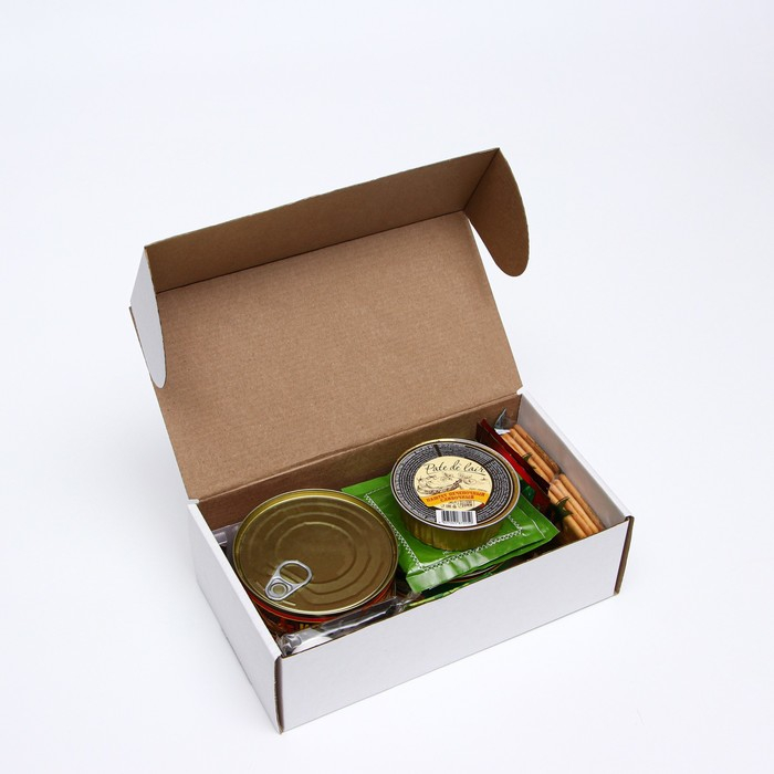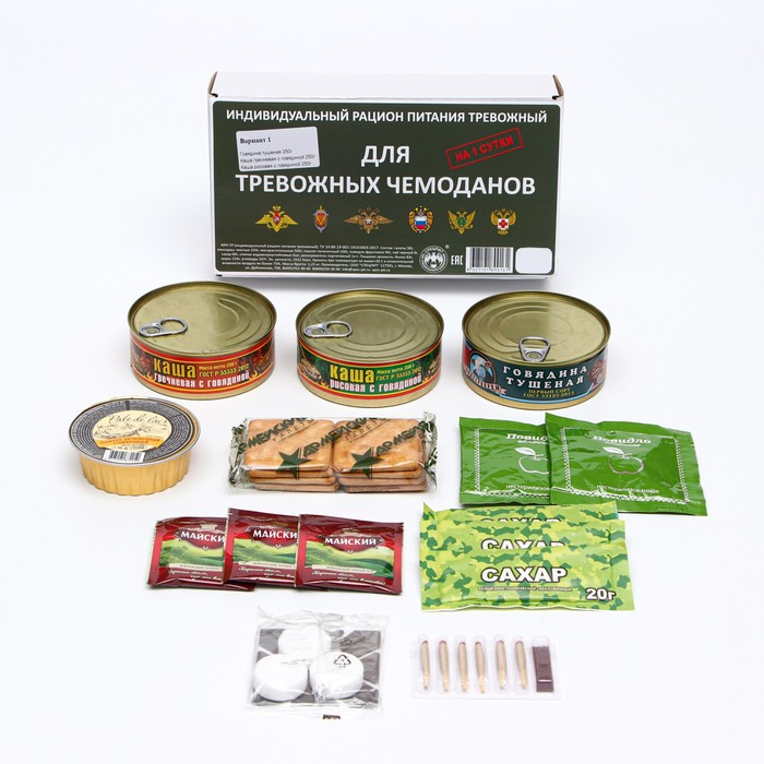 В состав входит всё необходимое, начиная от мясных консервов и заканчивая столовыми приборами. Каждый продукт в составе комплекта герметично запакован. Будьте уверены, что высокий срок годности и гибкие условия хранения не дадут пропасть вашему сухому пайку.