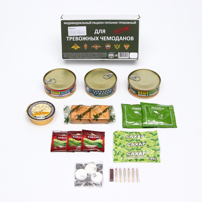 В состав входит всё необходимое, начиная от мясных консервов и заканчивая столовыми приборами. Каждый продукт в составе комплекта герметично запакован. Будьте уверены, что высокий срок годности и гибкие условия хранения не дадут пропасть вашему сухому пайку.