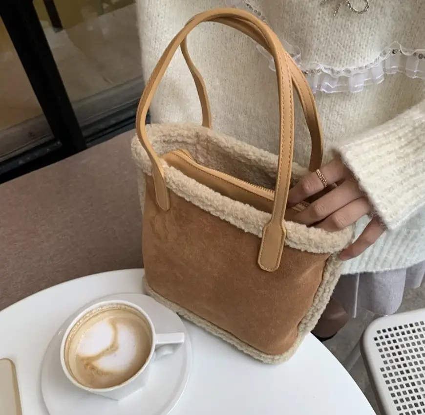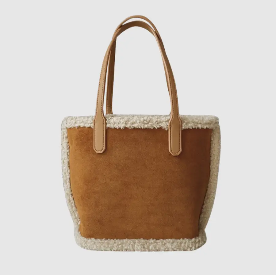 Сумка шоппер с мехом на плечо замша бежевая