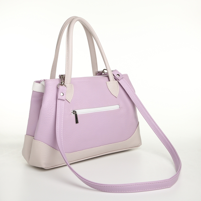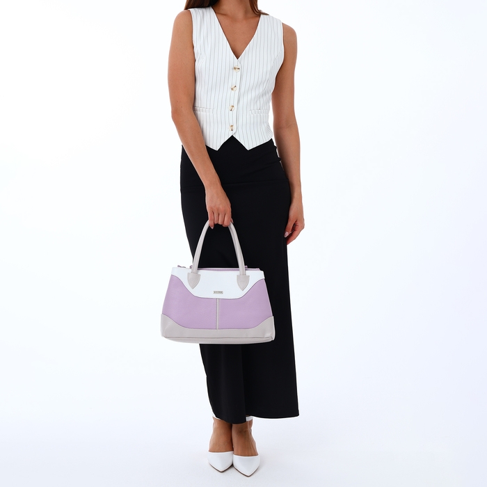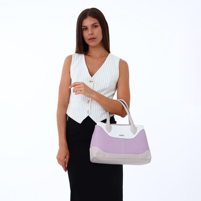 - Стиль и практичность: сочетание белого и сиреневого цветов делает её универсальным аксессуаром, подходящим к любому наряду.