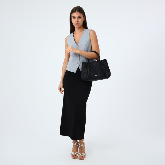 Эта сумка создана для тех, кто ценит элегантность и функциональность. Сдержанный и универсальный черный цвет, искусственная кожа высокого качества и продуманный дизайн делают её идеальным аксессуаром для любого случая — от деловых встреч до повседневных прогулок. Легкая, но вместительная, она предлагает основной отдел на молнии, где удобно разместятся ваши самые необходимые вещи, а наружный карман обеспечит быстрый доступ к мелочам.
