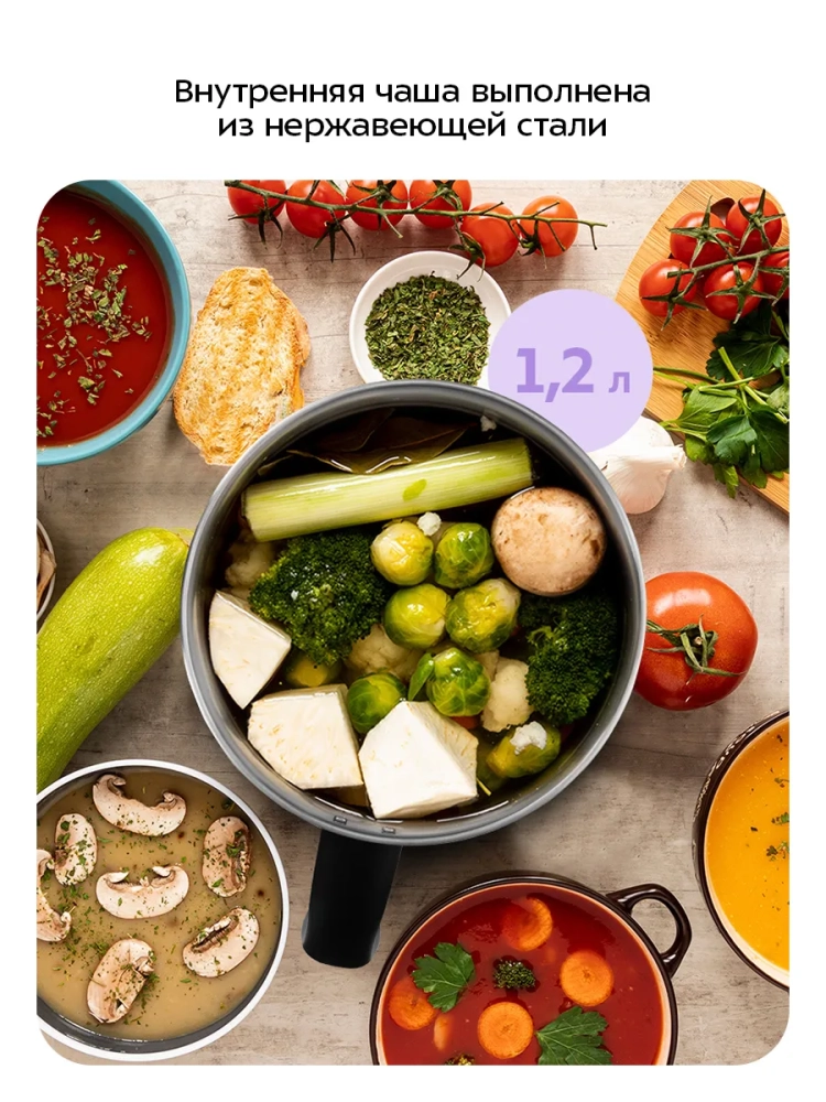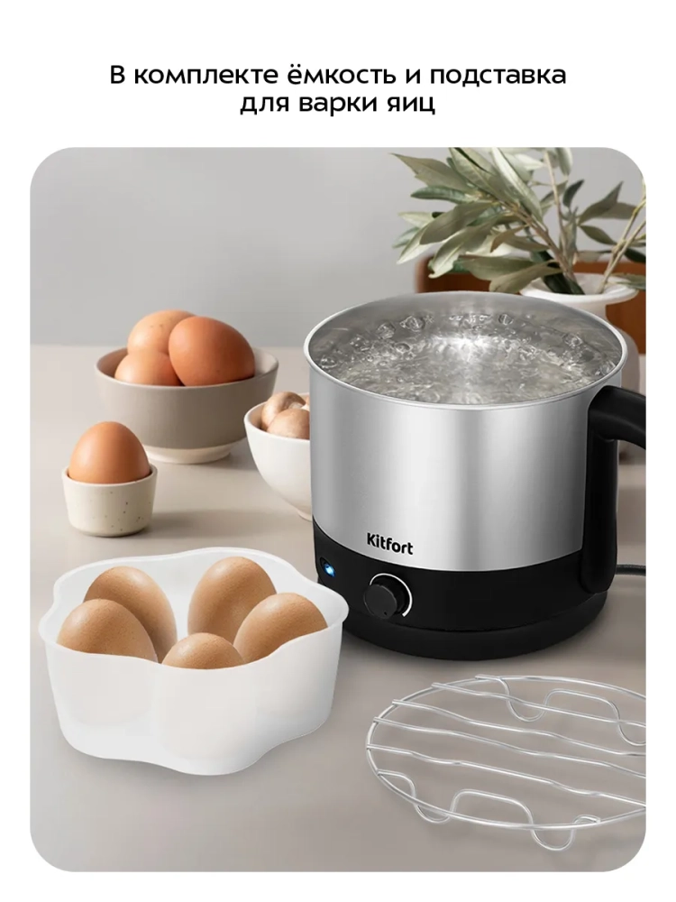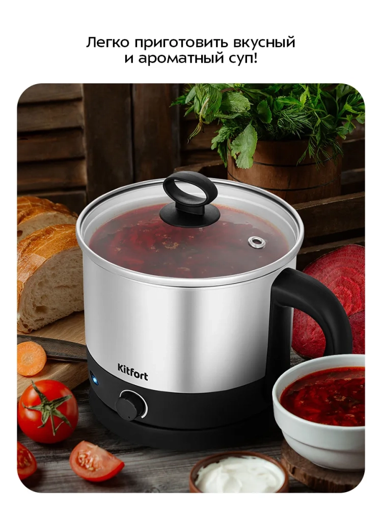Электрическая суповарка Kitfort КТ-223 — это незаменимый электро помощник на вашей кухне, который делает процесс приготовления супа простым и удобным. Этот мощный бытовой прибор с мощностью 600 Вт позволяет готовить вкусную и полезную еду без лишних хлопот. Супы являются важной частью готовки сбалансированной еды с овощами, фруктами, грибами и прочими продуктами и с помощью этой суповарки вы сможете легко включить их в свой рацион. Суповарка Kitfort выполнена из нержавеющей стали и пластика, что обеспечивает долговечность использования. Она оснащена крышкой, удобной ручкой и базой для устойчивости на поверхности. В комплект входит мини кастрюля для варки яиц и подставка для нее, что делает устройство еще и яйцеваркой. Объем рабочей емкости составляет 1,2 литра при общей вместимости 1,8 литра. Это позволяет приготовить достаточное количество супа в электрокастрюле за один раз как для небольшой семьи, так и для компании друзей. Благодаря автоматическому режиму работы вам не нужно постоянно следить за процессом: просто положите ингредиенты внутрь устройства, включите его — и через некоторое время ваш обед будет готов. Суповарка Kitfort КТ-223 идеально подходит как занятым людям с плотным графиком работы, так и мамам маленьких детей — она поможет быстро приготовить питательные супчики в чаше без лишних усилий. Напряжение прибора составляет ~220–240 В при частоте 50/60 Гц; класс защиты от поражения электрическим током: I. Этот товар станет отличным дополнением к вашему кухонному арсеналу благодаря своей универсальности использования: он может быть использован не только для приготовления супов или бульонов но также других блюд требующих длительного томления или варки.