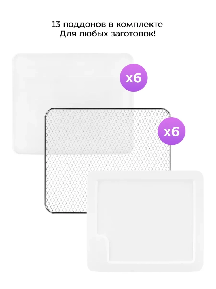 В комплект сушилки входят 6 металлических поддонов, 6 силиконовых ковриков и 1 пластиковый поддон.