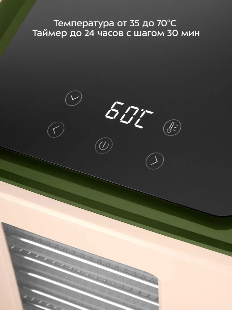 Прибор позволяет установить температуру сушки от 35 до 70 градусов с шагом 5 градусов и время сушки от 30 минут до 24 часов с шагом 30 минут.