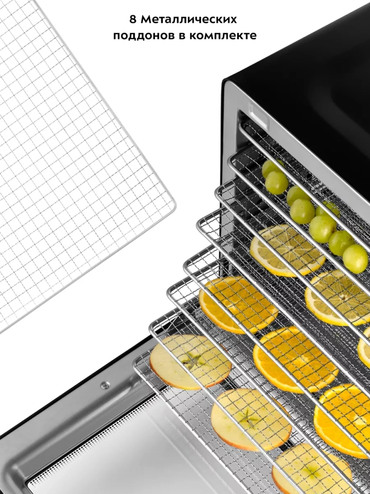 На сушилке можно установить температуру сушки в диапазоне 35–70 *С с шагом 1 *С. Сушилка оснащена таймером до 48 часов работы с шагом 1 час, также можно установить время работы в минутах до 1 часа с шагом 1 минута.