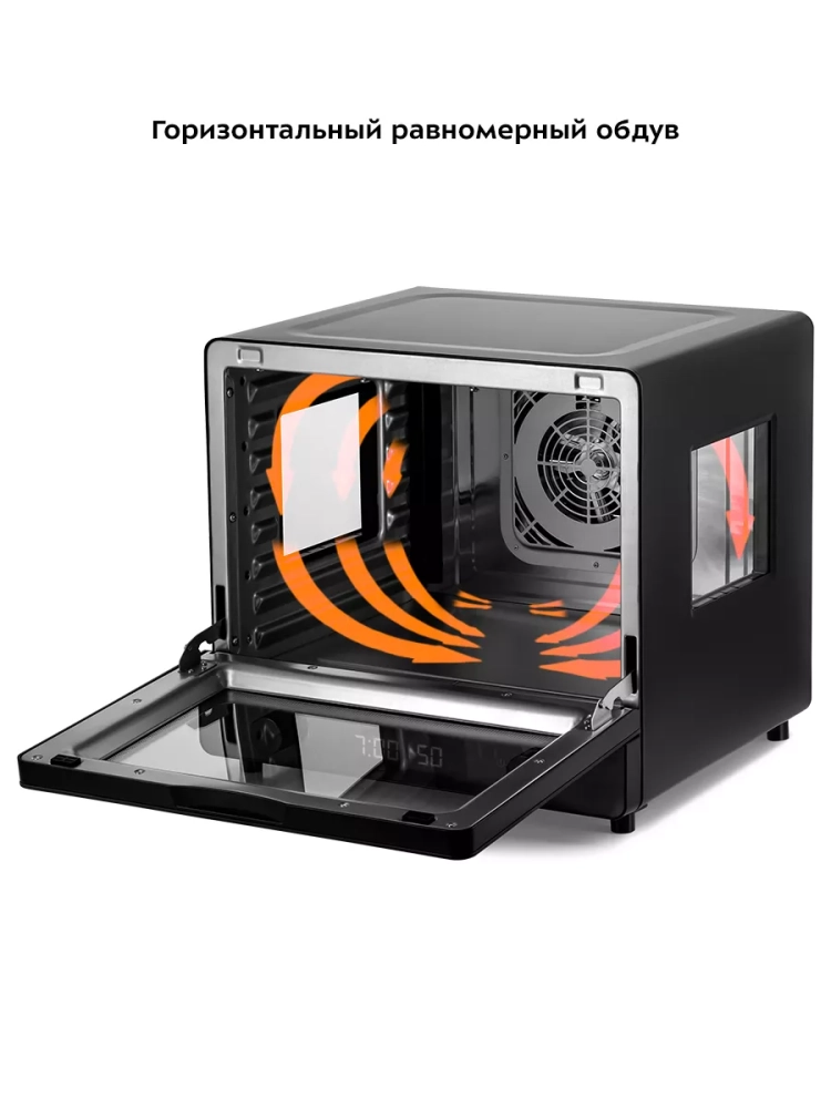 В сушилке установлен мощный нагревательный элемент и вентилятор с лопастями большого диаметра, обеспечивающий равномерное распределение нагретого воздуха по всему объему камеры. Благодаря горизонтальному обдуву смешение запахов при сушке одновременно разных продуктов минимально.