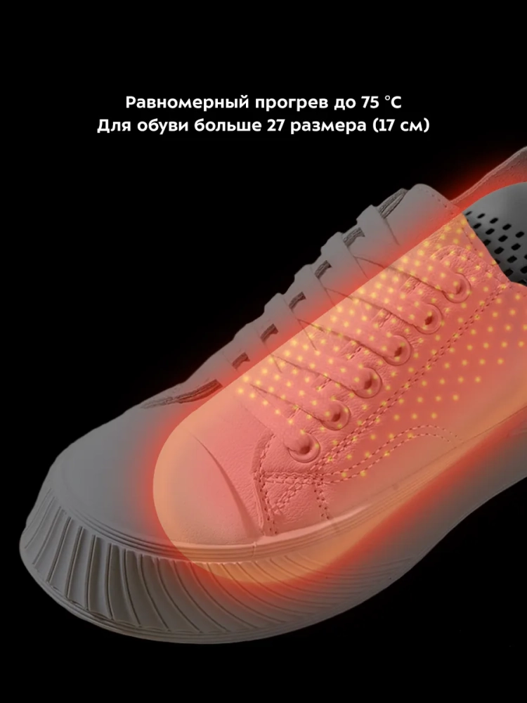 Сушилка хорошо располагается практически в любой обуви больше 27 размера (17 см). Лаконичный и обтекаемый корпус поместится в обуви сложной модели.