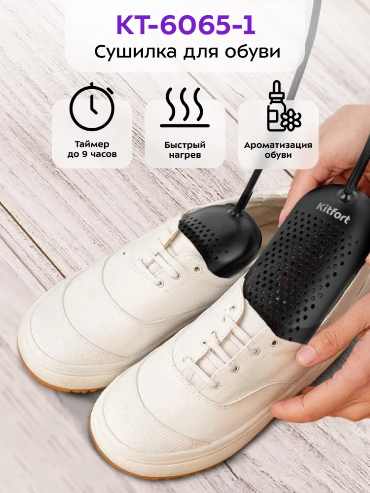 Сушилка для обуви Kitfort KT-6065 эффективно высушит любую промокшую после дождя или снега обувь. Также сушилку можно использовать для сушки обуви после долгого рабочего дня, так как при длительном ношении обувь становится влажной из-за пота. Такая процедура сушки обуви снижает риск развития грибка ног.