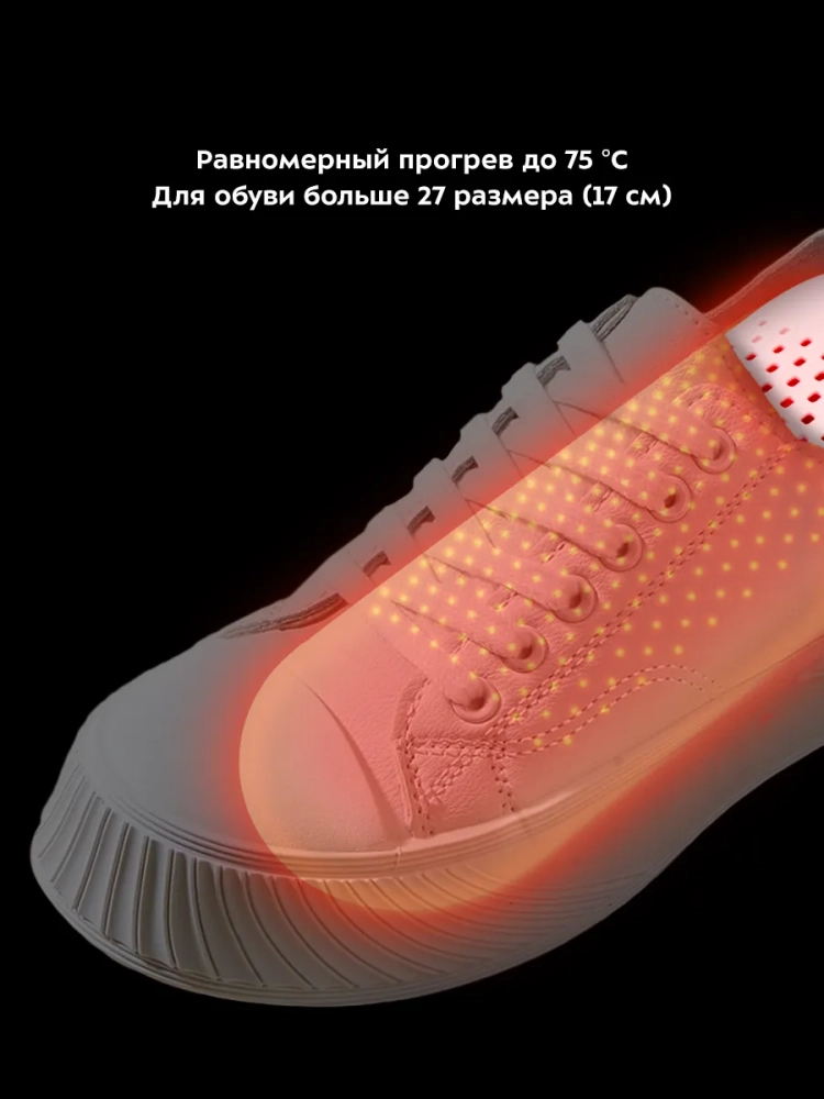 Сушилка хорошо располагается практически в любой обуви больше 27 размера (17 см). Лаконичный и обтекаемый корпус поместится в обуви сложной модели.