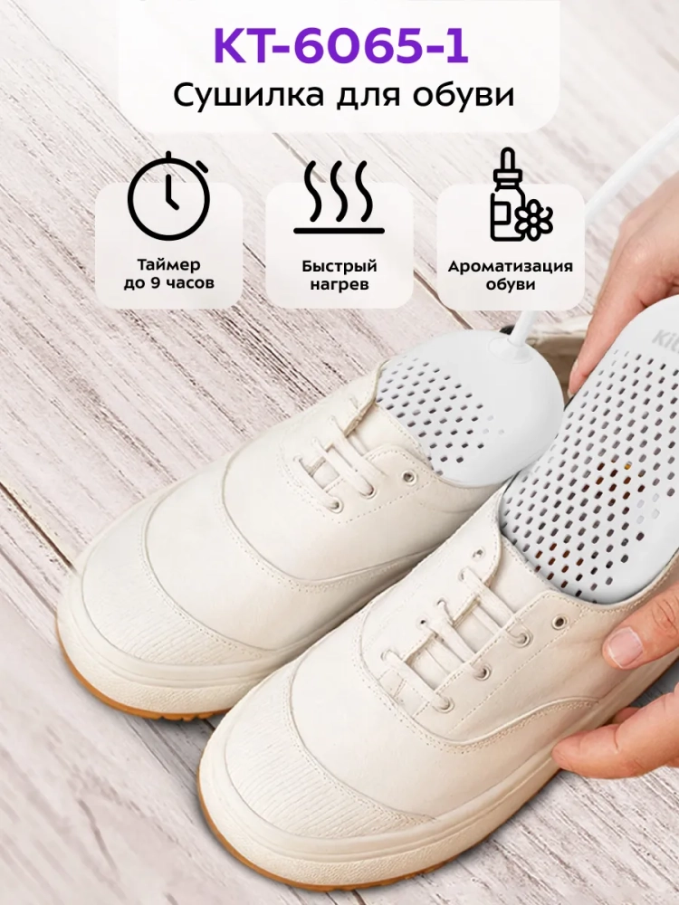 Сушилка для обуви Kitfort KT-6065 эффективно высушит любую промокшую после дождя или снега обувь. Также сушилку можно использовать для сушки обуви после долгого рабочего дня, так как при длительном ношении обувь становится влажной из-за пота. Такая процедура сушки обуви снижает риск развития грибка ног.