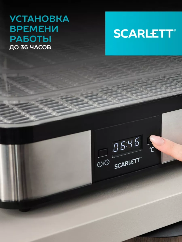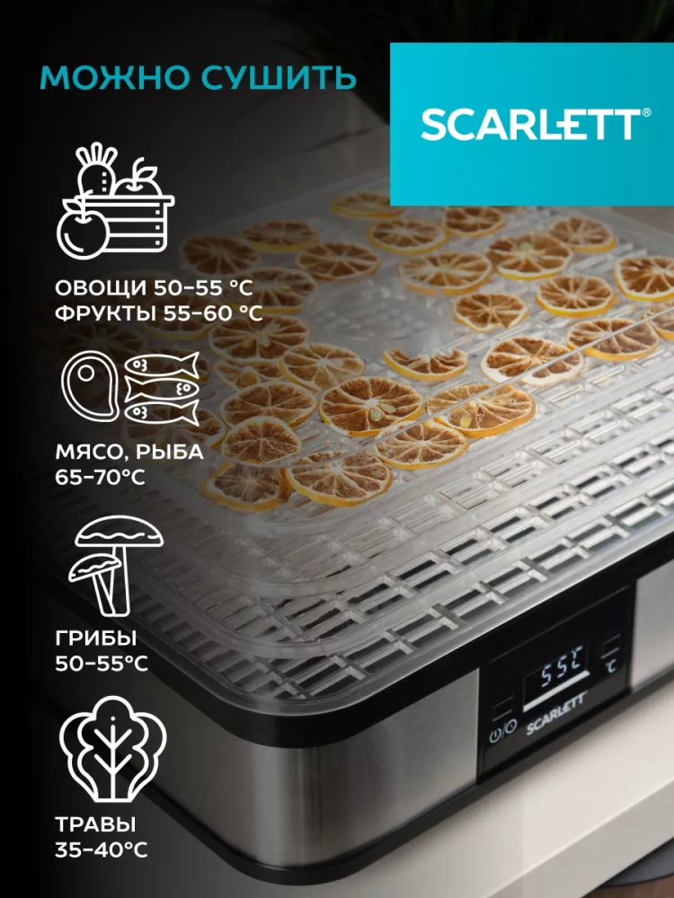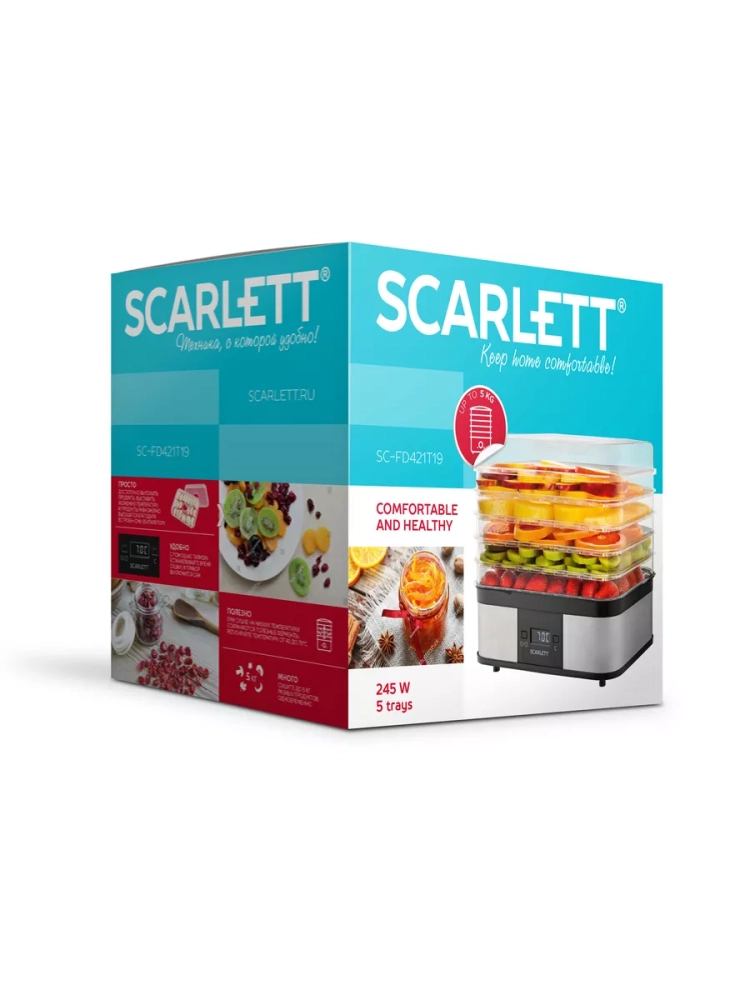 Сушилка для овощей и фруктов SC-FD421T19 - помощница для всех, кто заботится о своем здоровье, для дачников, грибников и любителей домашних заготовок. С ее помощью можно сушить овощи, фрукты, ягоды, зелень и грибы в домашних условиях. Сушеные сезонные продукты сохраняют свои полезные свойства для организма длительное время. В сушке SC-FD421T19 предусмотрены электронная панель управления с таймером для установки нужного времени сушки продуктов, 5 прозрачных поддонов c максимальной загрузкой до 1 кг. каждый, регулировка температуры от 40 до 70 C, встроенный вентилятор для равномерной сушки продуктов. С помощью дегидратора SC-FD421T19 можно сушить до 5 кг. продуктов одновременно, а в инструкции к прибору Вы найдете рекомендации по сушке разных продуктов.