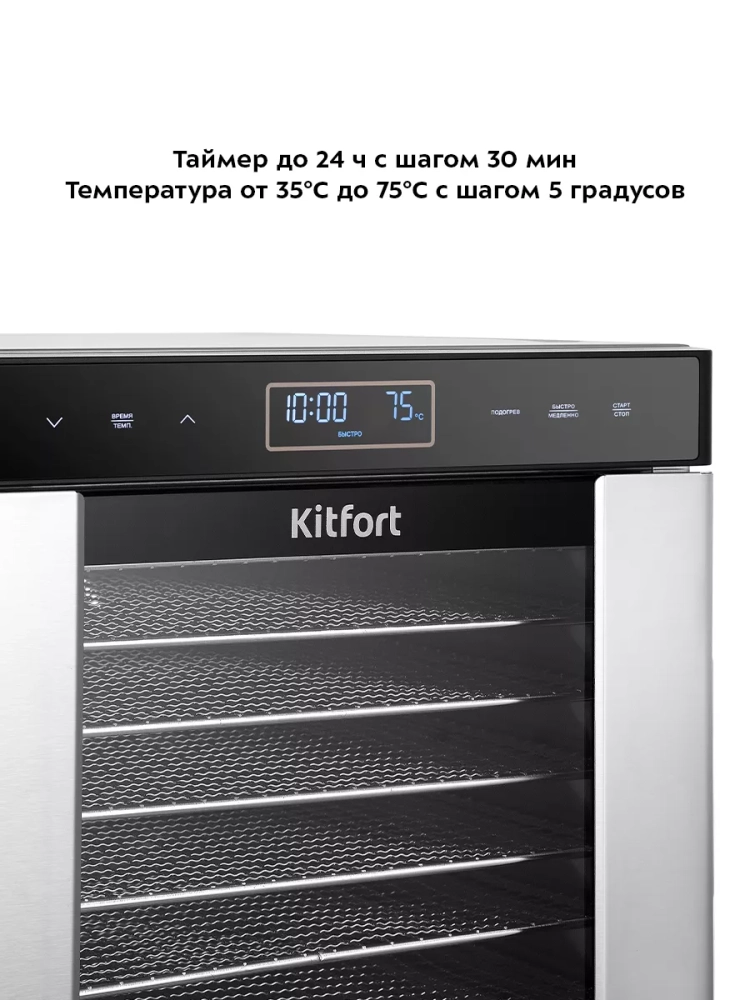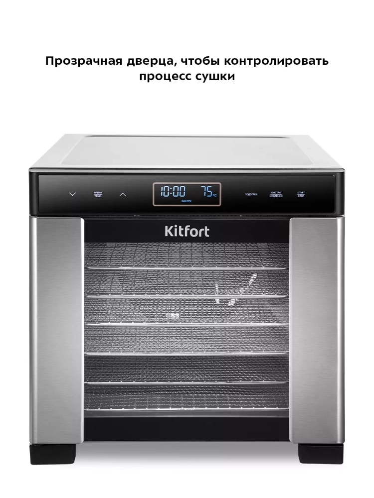 Сушилка Kitfort отличается высокой эффективностью и равномерностью сушки благодаря продуманной системе циркуляции воздуха. Это делает возможным создание полезных заготовок для долгого хранения. Процесс сушки позволяет сохранить натуральные вкусовые качества и питательные вещества свежих овощей и фруктов. Включенная техника обеспечивает быструю сушки без потери качества продукта. Электрическая система управления позволяет точно контролировать процесс дегидрации.
