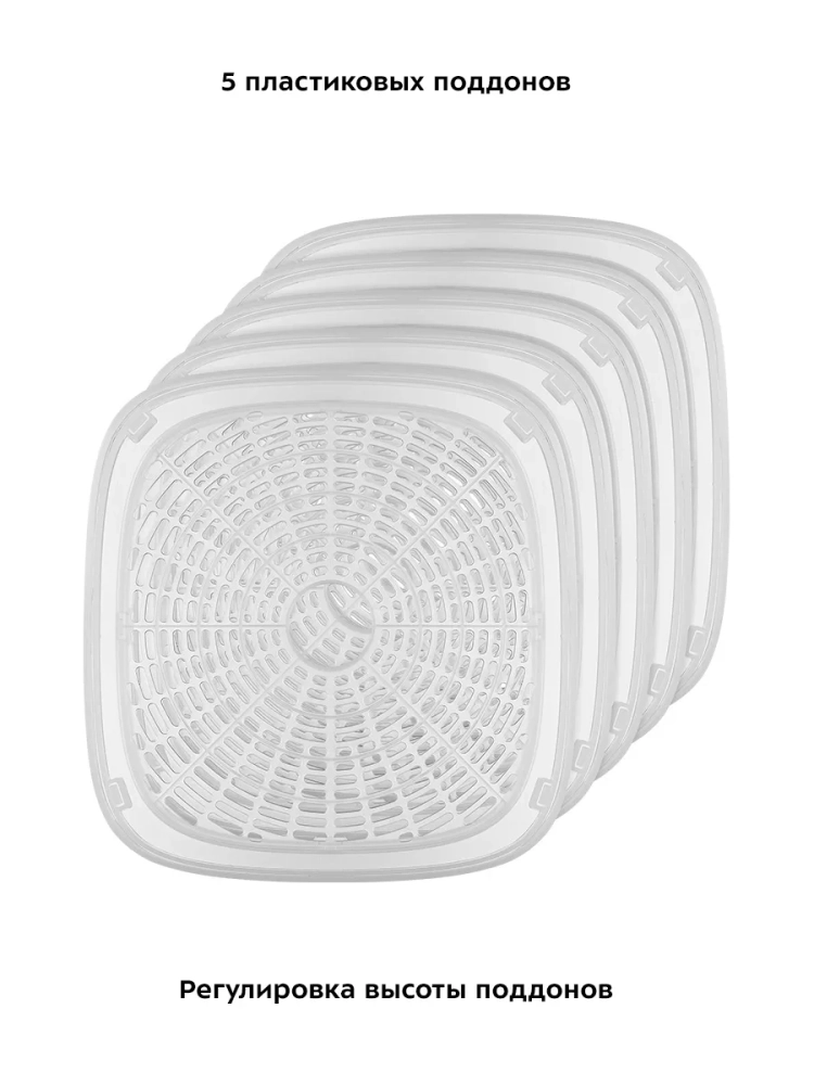 Сушилка имеет в комплекте 5 поддонов из пластика и крышку.