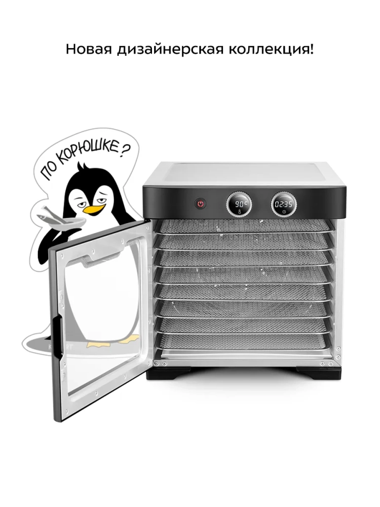 Температуру сушки можно изменить от 20 до 90 °С с шагом 5 °С. Сушилка оснащена таймером до 24 часов работы с шагом 5 минут.
