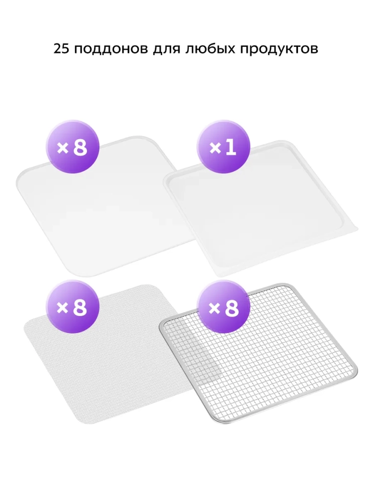 Сушилка имеет в комплекте 8 металлических поддонов, 8 сеток для мелких продуктов и 8 силиконовых сплошных поддонов. Также в комплект входит 1 поддон для жидкости, который облегчает очистку устройства: на поддон попадают остатки от продуктов и сок, после чего поддон легко достать и очистить, а дно камеры сушилки остается чистым.