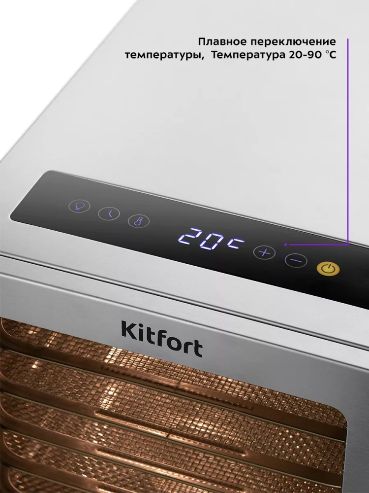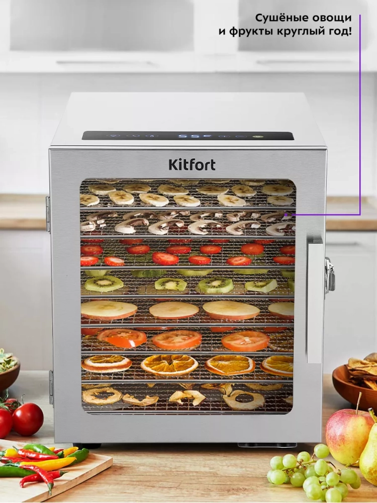 Электрическая сушилка Kitfort КТ-1998 предназначена для сушки овощей, фруктов, ягод, грибов, корнеплодов, трав и зелени, а также мяса и рыбы, хлеба.