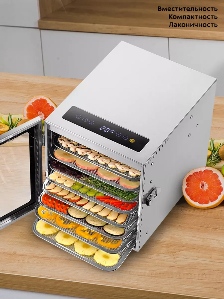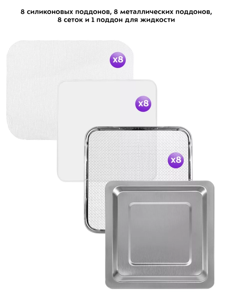 Сушилка имеет в комплекте 8 металлических поддонов, 8 сеток для мелких продуктов и 8 силиконовых сплошных поддонов. Также в комплект входит 1 поддон для жидкости, который облегчает очистку устройства: на поддон попадают остатки от продуктов и сок, после чего поддон легко достать и очистить, а дно камеры сушилки остается чистым.