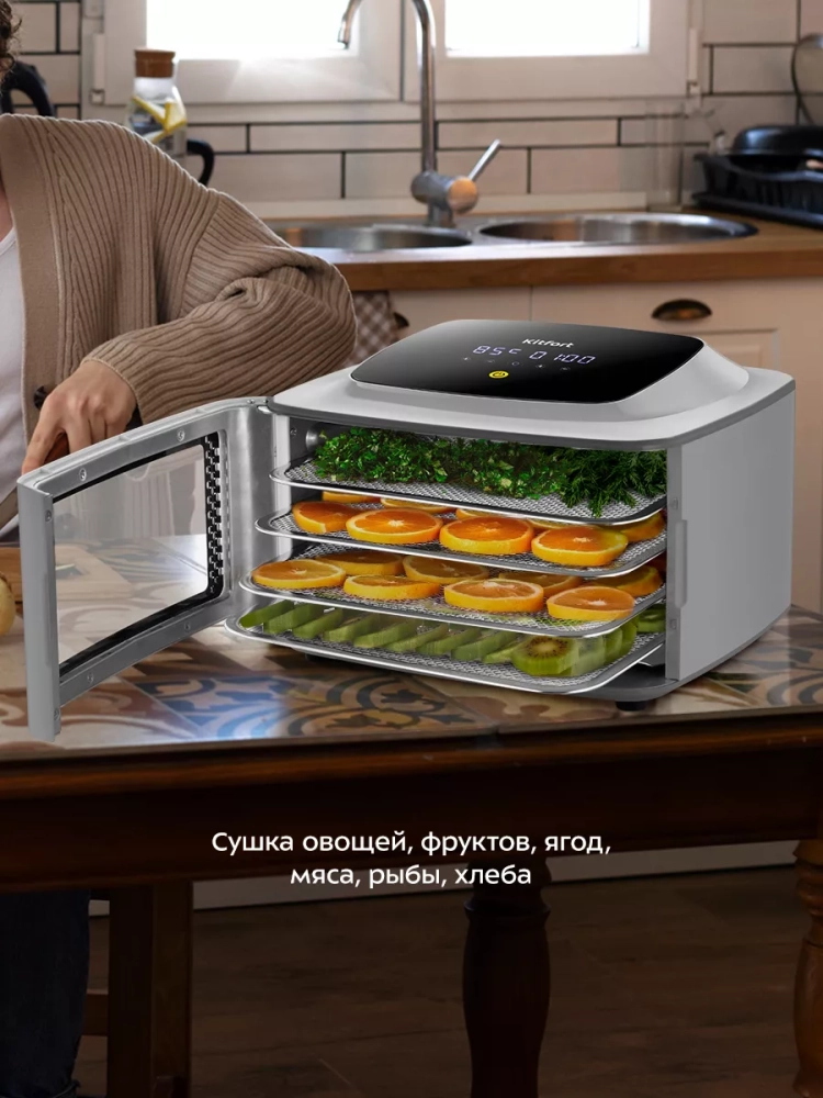 Электрическая сушилка Kitfort КТ-4906 предназначена для сушки овощей, фруктов, ягод, грибов, корнеплодов, трав и зелени, а также мяса и рыбы, хлеба.