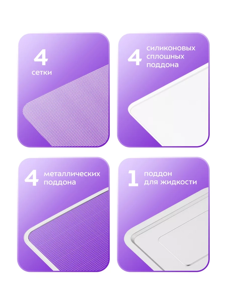 Сушилка имеет в комплекте 4 металлических поддона, 4 сетки для мелких продуктов и 4 силиконовых сплошных поддона. Также в комплект входит 1 поддон для жидкости, который облегчает очистку устройства: на поддон попадают остатки от продуктов и сок, после чего поддон легко достать и очистить, а дно камеры сушилки остается чистым.