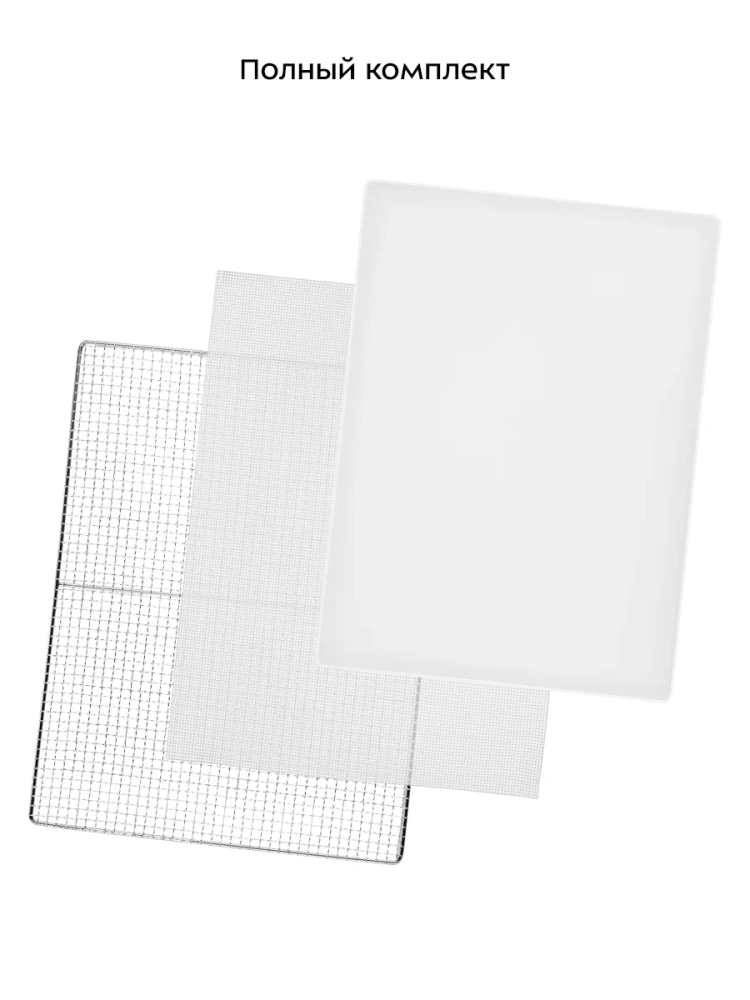 Сушилка имеет в комплекте 12 металлических поддонов, 12 сеток для мелких продуктов и 12 силиконовых сплошных поддонов. Также в комплект входит 1 поддон для жидкости, который облегчает очистку устройства: на поддон попадают остатки от продуктов и сок, после чего поддон легко достать и очистить, а дно камеры сушилки остается чистым.
