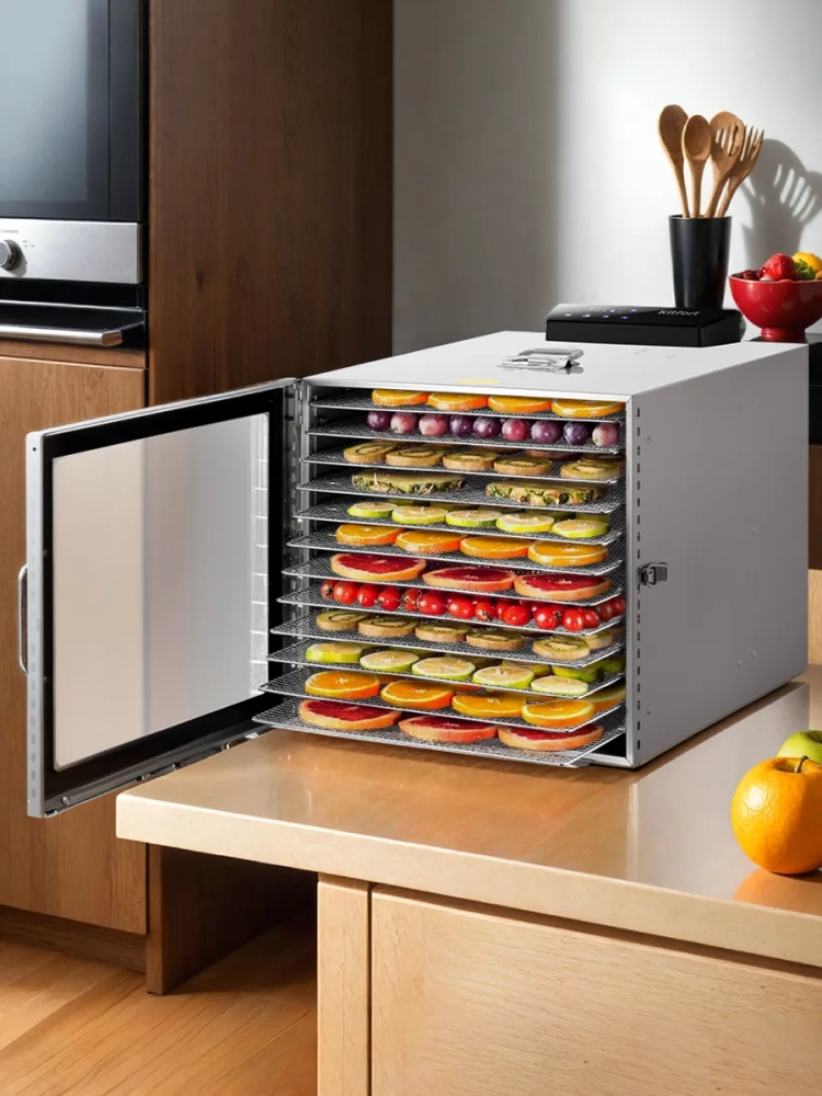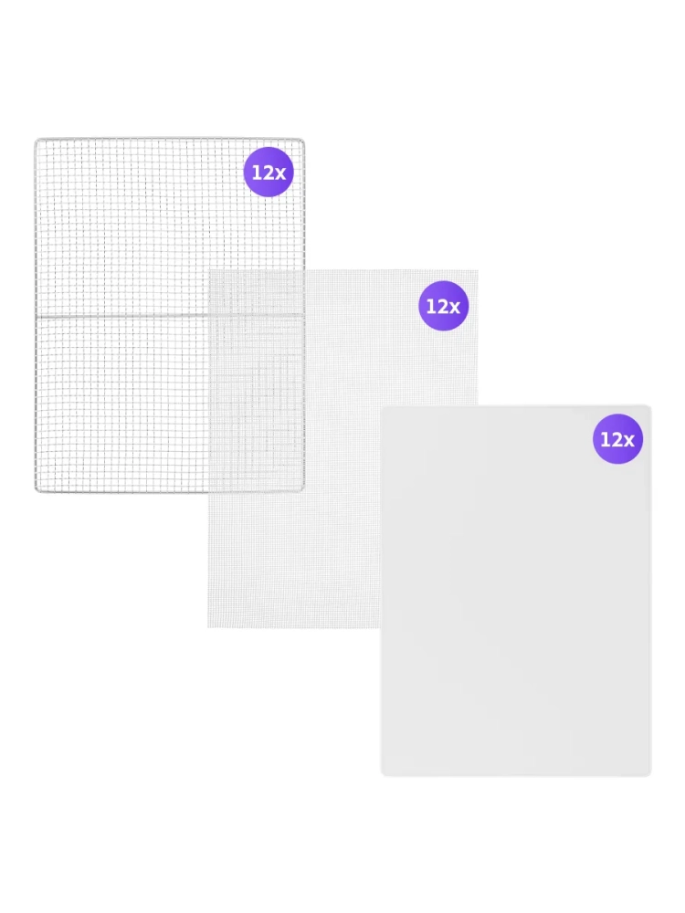 Сушилка имеет в комплекте 12 металлических поддонов, 12 сеток для мелких продуктов и 12 силиконовых сплошных поддонов. Также в комплект входит 1 поддон для жидкости, который облегчает очистку устройства: на поддон попадают остатки от продуктов и сок, после чего поддон легко достать и очистить, а дно камеры сушилки остается чистым.
