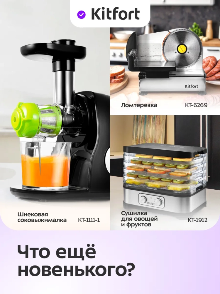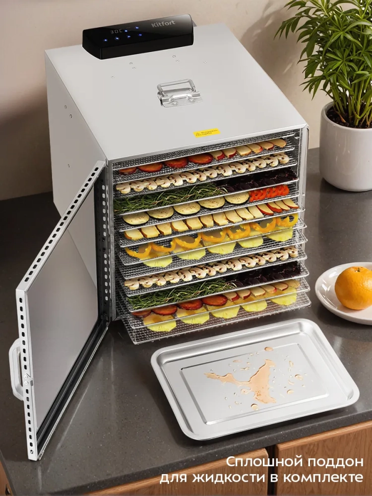 Электрическая сушилка Kitfort КТ-4915 предназначена для сушки овощей, фруктов, ягод, грибов, корнеплодов, трав и зелени, а также мяса, рыбы и хлеба.