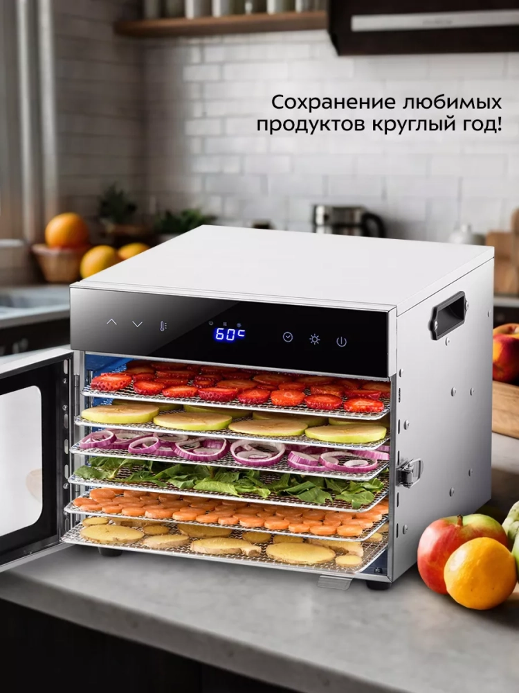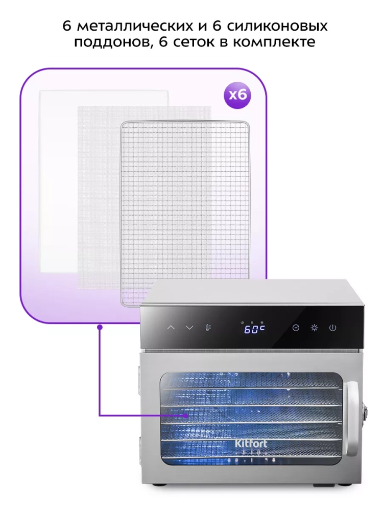 Сушилка имеет в комплекте 6 металлических сетчатых поддонов, 6 силиконовых сплошных поддонов и 6 сеток.