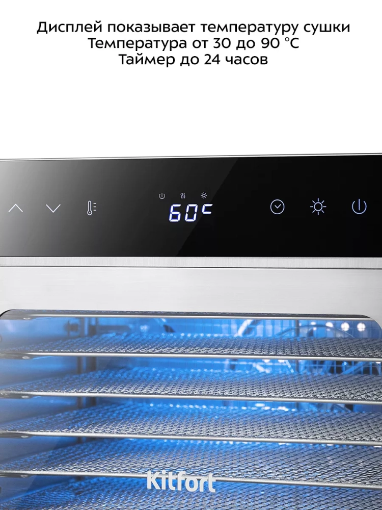 Температуру сушки можно изменить от 30 до 90 °С с шагом 5 °С. Сушилка оснащена таймером от 30 минут до 24 часов работы с шагом 30 минут.