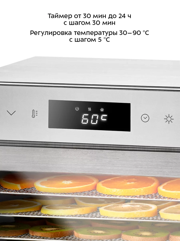Температуру сушки можно изменить от 30 до 90 °С с шагом 5 °С. Сушилка оснащена таймером от 30 минут до 24 часов работы с шагом 30 минут.