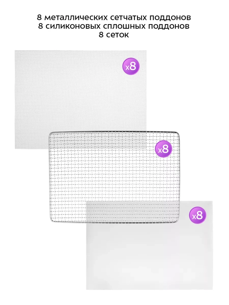 Сушилка имеет в комплекте 8 металлических сетчатых поддонов, 8 силиконовых сплошных поддонов и 8 сеток.