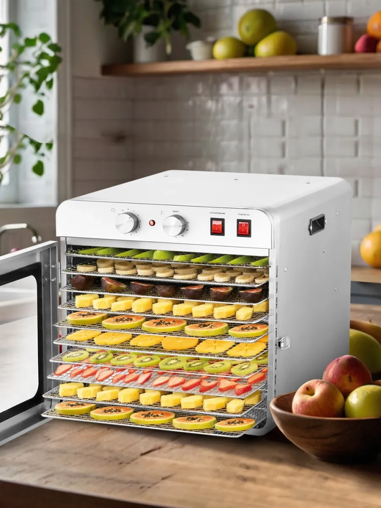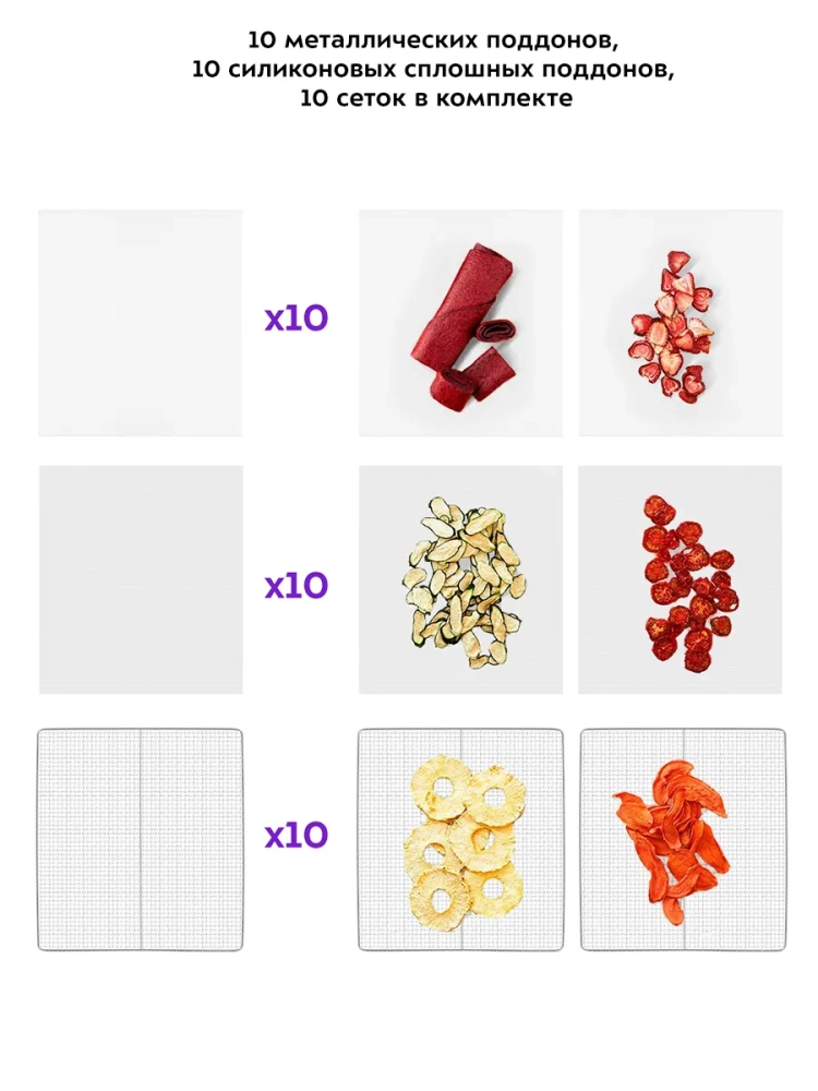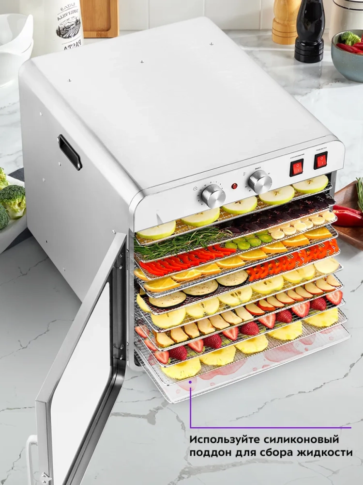 Сушилка имеет в комплекте 10 металлических сетчатых поддонов, 10 силиконовых сплошных поддонов и 10 сеток. Температуру сушки можно изменить от 30 до 90 °С. Сушилка оснащена таймером до 12 часов работы. Также в сушилке есть подсветка, благодаря которой вы сможете наблюдать за процессом сушки.