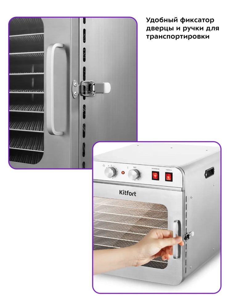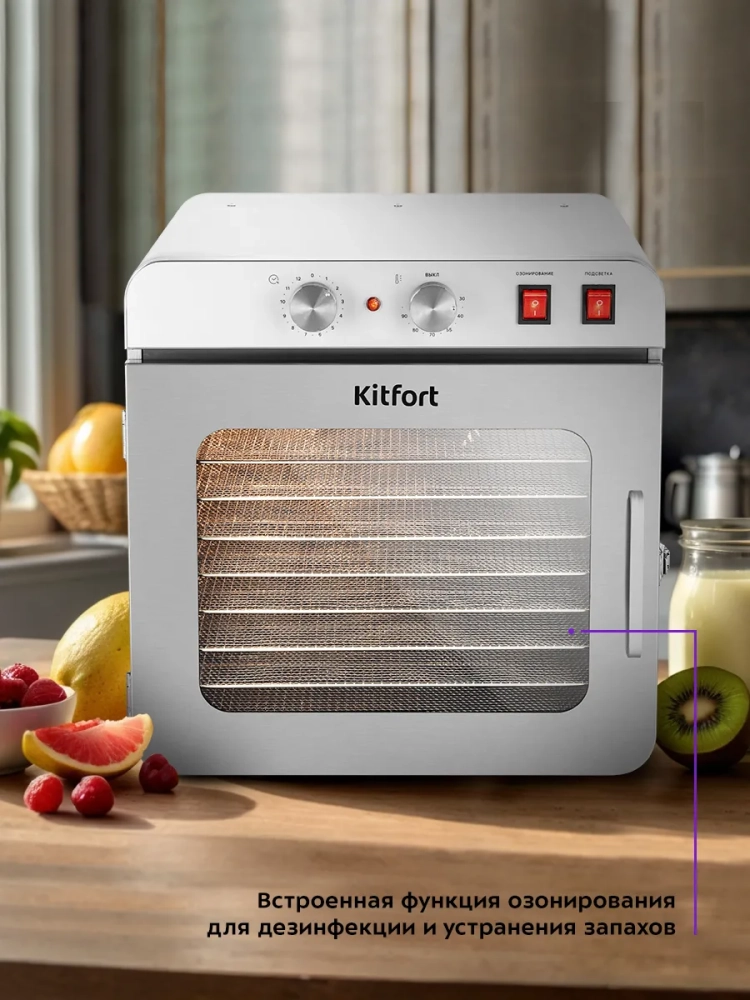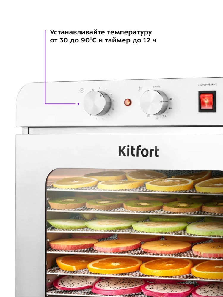 Электрическая сушилка Kitfort КТ-4924 предназначена для сушки овощей, фруктов, ягод, грибов, корнеплодов, трав и зелени, а также мяса и рыбы, хлеба.