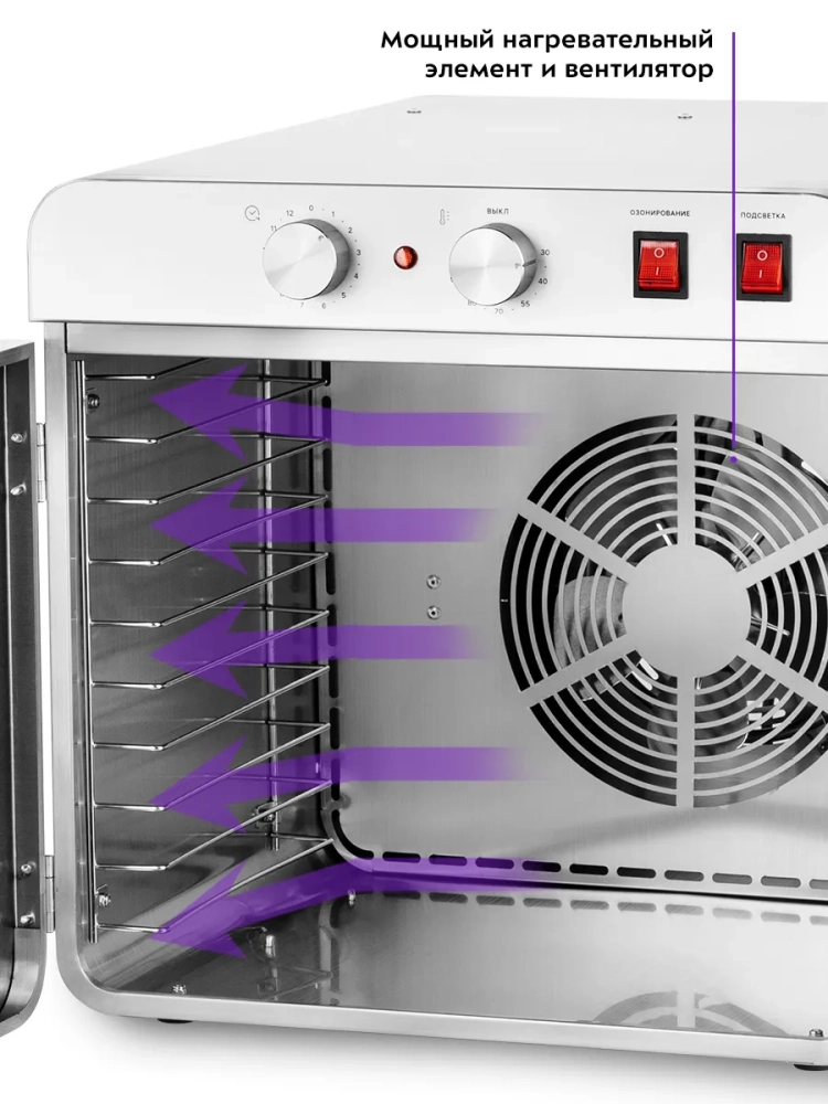 В сушилку установлены мощный нагревательный элемент и вентилятор, обеспечивающий равномерное распределение нагретого воздуха по всему объему камеры. Благодаря горизонтальному обдуву смешение запахов при одновременной сушке разных продуктов минимально.
