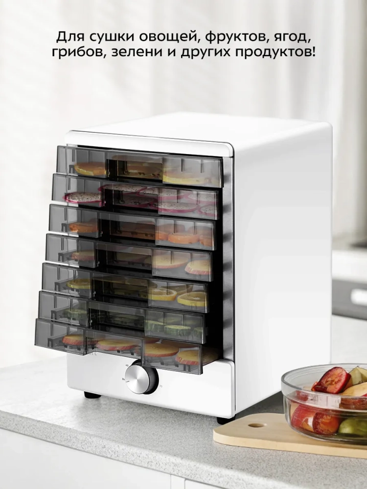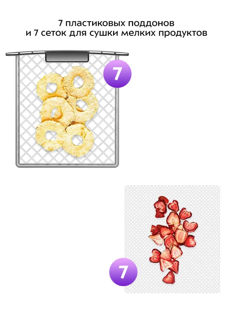 В комплект сушилки входят 7 пластиковых поддонов и 7 сеток для сушки мелких продуктов.