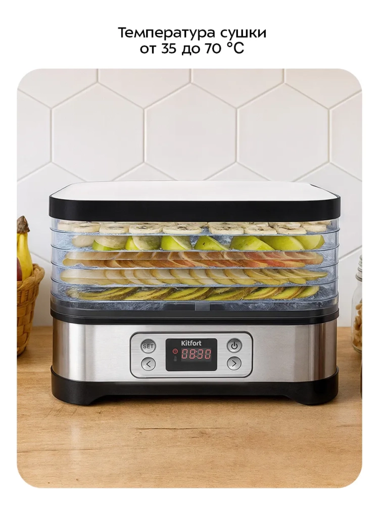 Дегидратор Kitfort — это не просто бытовая техника, а незаменимый инструмент для тех, кто любит готовить и заботится о здоровье. Сушилки для овощей и фруктов позволяют сохранить натуральный вкус и питательные вещества продуктов. Используйте эту кухонную технику для сушки рыбы, мяса и других продуктов, чтобы наслаждаться их вкусом в любое время года.
