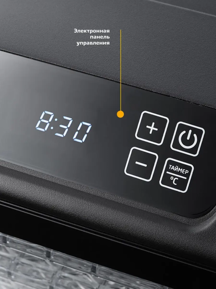 На сушилке можно установить температуру сушки в диапазоне 35–70 *С с шагом 5 градусов. Сушилка оснащена таймером до 19,5 часов работы с шагом 30 минут.