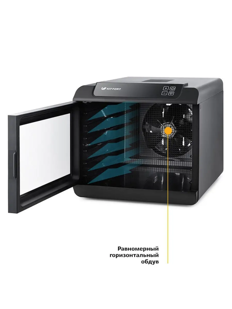 В сушилке установлен мощный нагревательный элемент и вентилятор большого диаметра, обеспечивающий равномерное распределение нагретого воздуха по всему объему камеры. Благодаря горизонтальному обдуву смешение запахов при сушке одновременно разных продуктов минимально.
