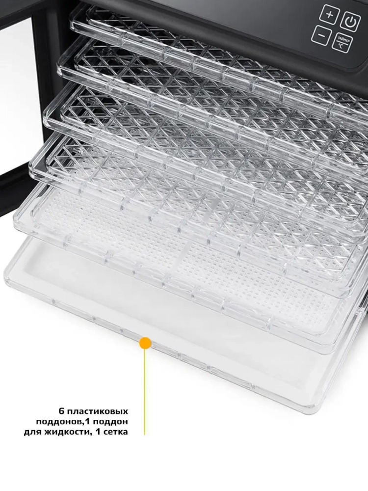 Сушилка имеет в комплекте 6 поддонов из пищевого пластика, 1 поддон для жидкости и 1 сетку.