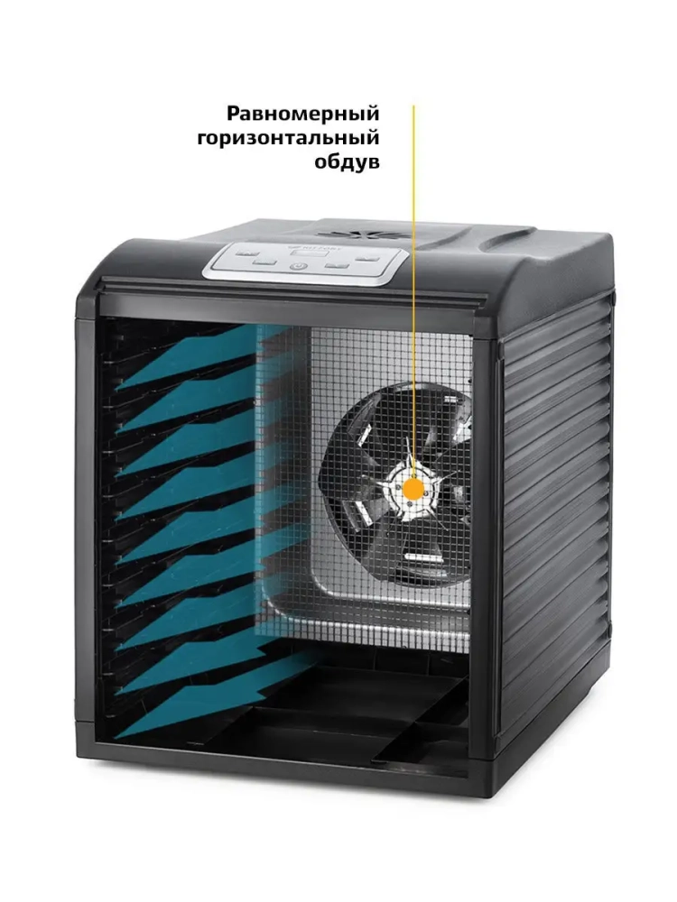 В сушилке установлен мощный нагревательный элемент и вентилятор большого диаметра, обеспечивающий равномерное распределение нагретого воздуха по всему объему камеры. Благодаря горизонтальному обдуву смешение запахов при сушке одновременно разных продуктов минимально.