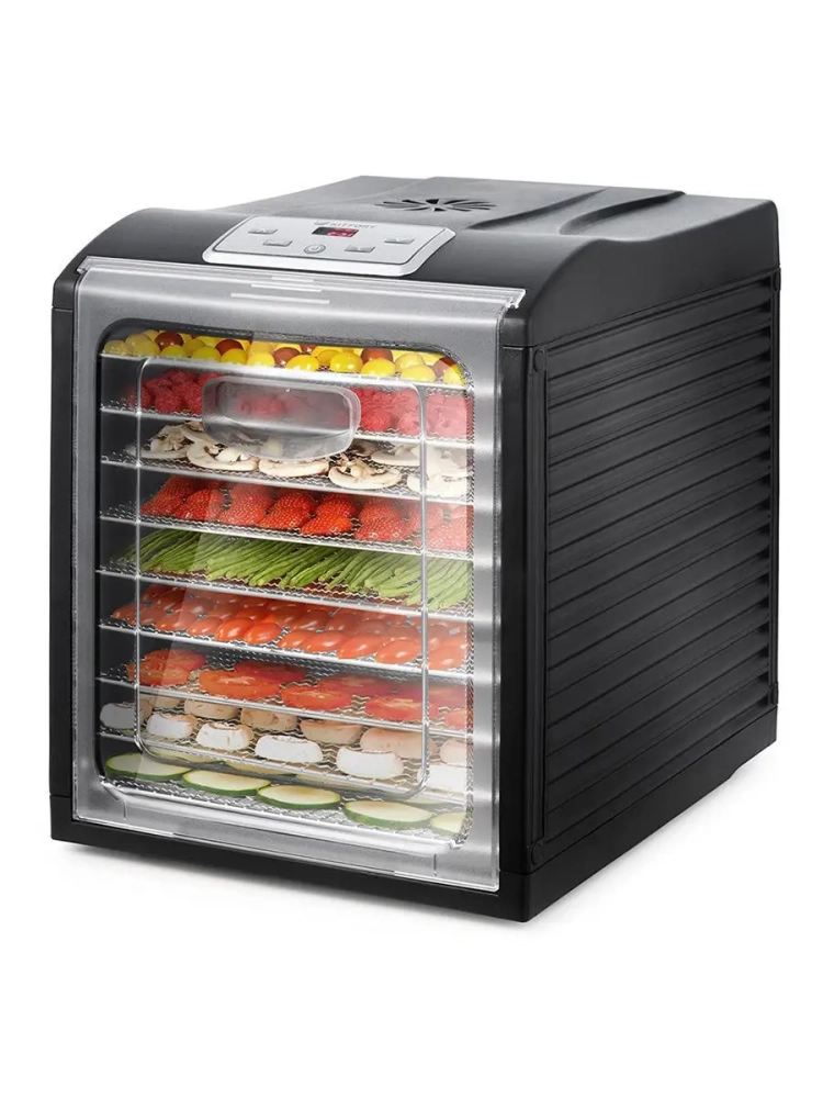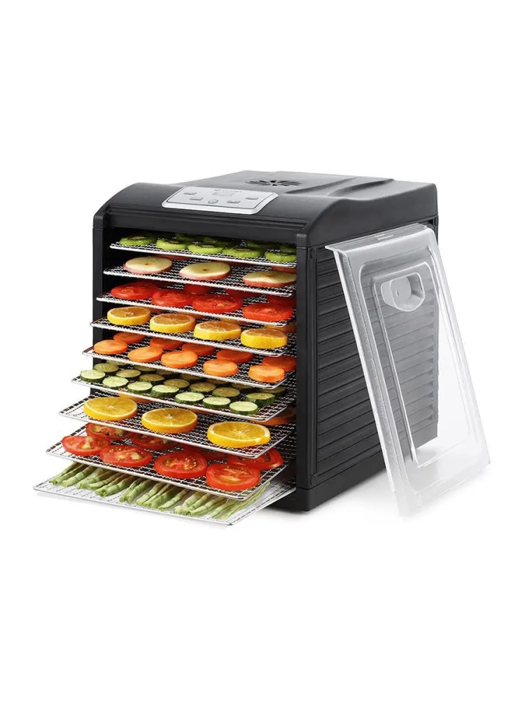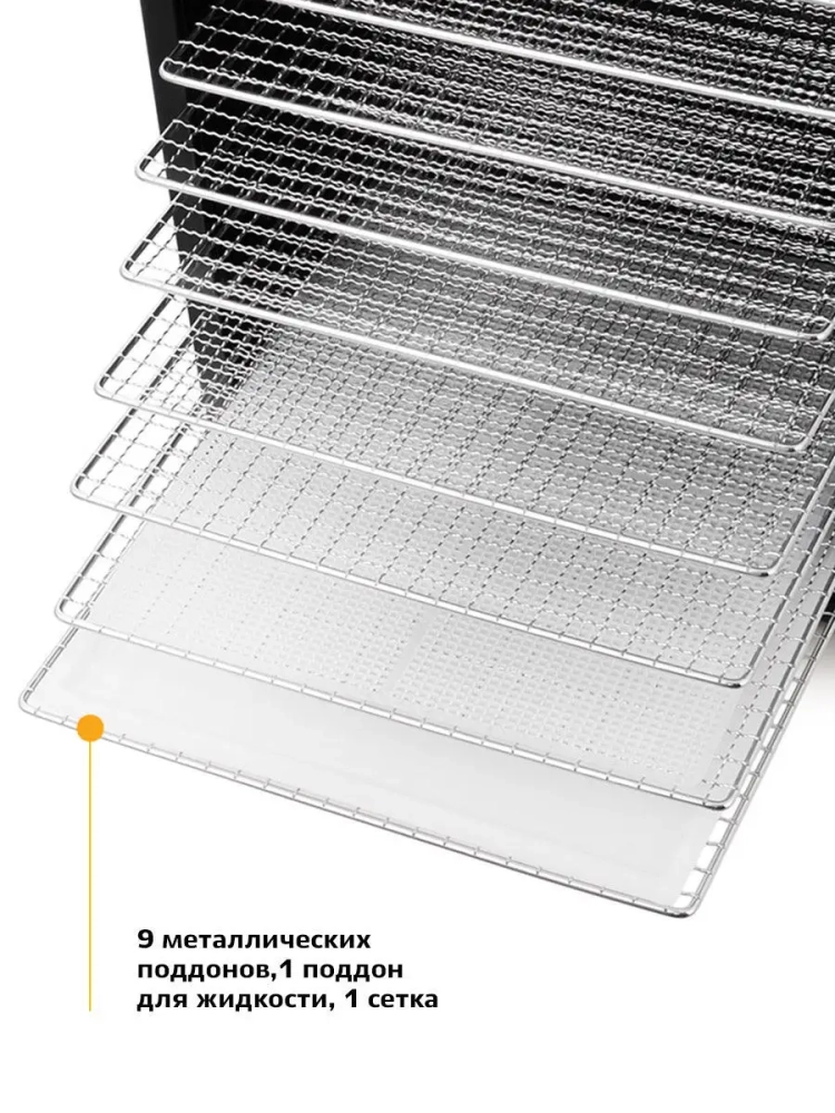 Сушилка имеет в комплекте 9 поддонов из нержавеющей стали, 1 поддон для жидкости и 1 сетку.