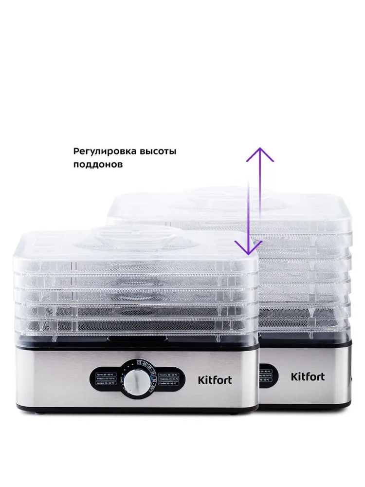 Сушилка имеет в комплекте 5 поддонов из нержавеющей стали с прозрачными стенками, поэтому вы легко можете наблюдать за процессом сушки.