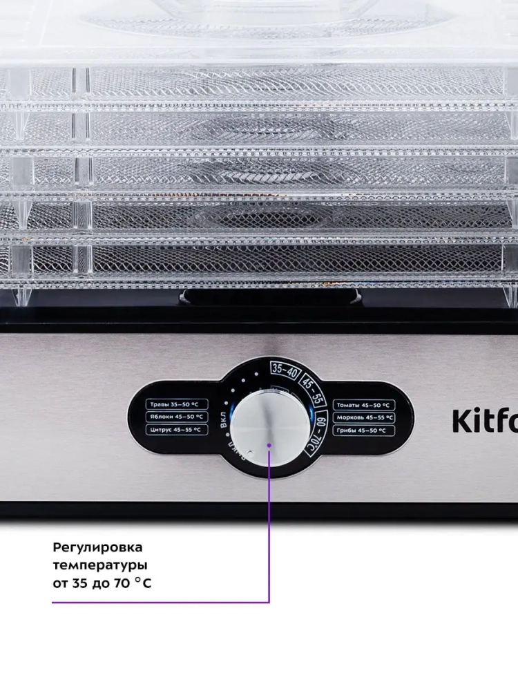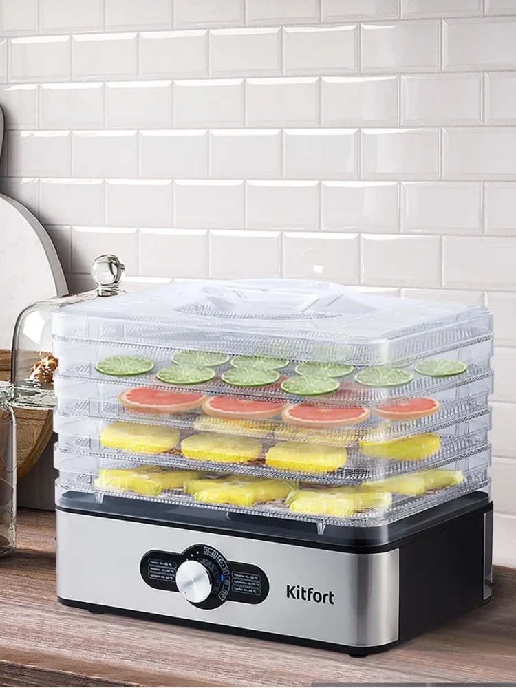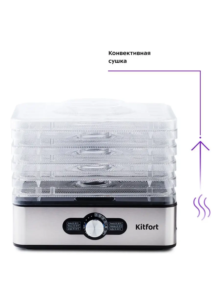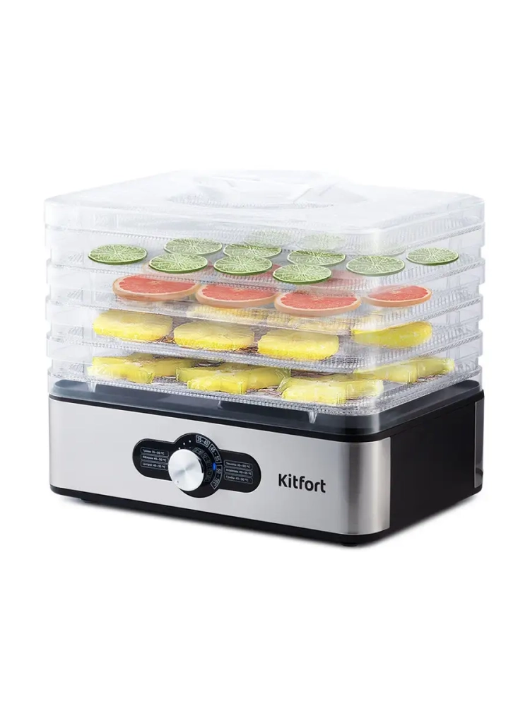Электрическая сушилка для овощей и фруктов Kitfort КТ-1913 предназначена для сушки овощей, фруктов, ягод, грибов, корнеплодов, трав и зелени, а также хлеба.
