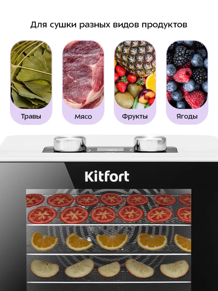 Электрическая сушилка Kitfort КТ-1915 предназначена для сушки овощей, фруктов, ягод, грибов, корнеплодов, трав и зелени, а также мяса и рыбы, хлеба. С помощью специального поддона для жидкости можно готовить пастилу. Сушилка имеет в комплекте 4 поддона из нержавеющей стали и 1 поддона для жидкости. В сушилке установлен мощный нагревательный элемент и вентилятор большого диаметра, обеспечивающий равномерное распределение нагретого воздуха по всему объему камеры. Благодаря горизонтальному обдуву смешение запахов при сушке одновременно разных продуктов минимально. На сушилке можно установить температуру сушки в диапазоне 35-70 *С с шагом 5 градусов. Сушилка оснащена таймером до 24 часов работы с шагом 1 час.