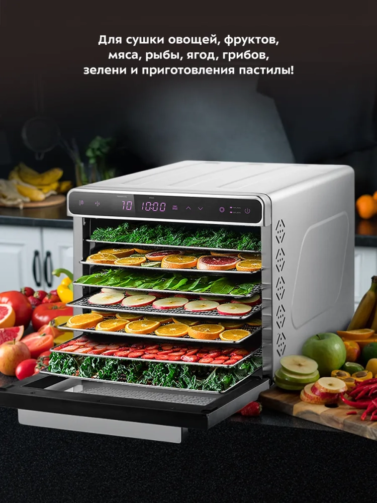 Электрическая сушилка Kitfort КТ-1925 предназначена для сушки овощей, фруктов, ягод, грибов, корнеплодов, трав и зелени, а также мяса и рыбы, хлеба. С помощью специальных сплошных поддонов можно готовить пастилу. В комплекте к сушилке идут 7 металлических поддонов, 7 сеток и 7 сплошных пластиковых поддонов. В сушилке установлен мощный нагревательный элемент и вентилятор с лопастями большого диаметра, обеспечивающий равномерное распределение нагретого воздуха по всему объему камеры. Благодаря горизонтальному обдуву смешение запахов при сушке одновременно разных продуктов минимально. У сушилки есть 3 предустановленных режима. Первый режим — это режим для поддержания тепла (после окончания сушки продуктов устройство будет еще работать 24 часа с температурой 35 градусов). И два режима с уже установленными параметрами для быстрой и медленной сушки. Эти режимы можно выбрать в настройках. На сушилке можно установить температуру сушки в диапазоне 35–75 *С с шагом 5 градусов. Сушилка оснащена таймером до 24 часов работы с шагом 30 мин.