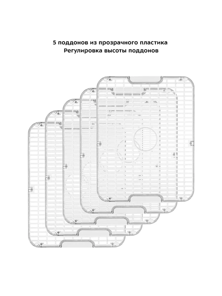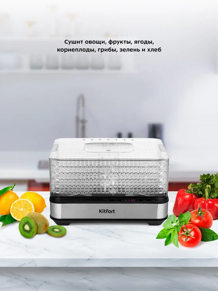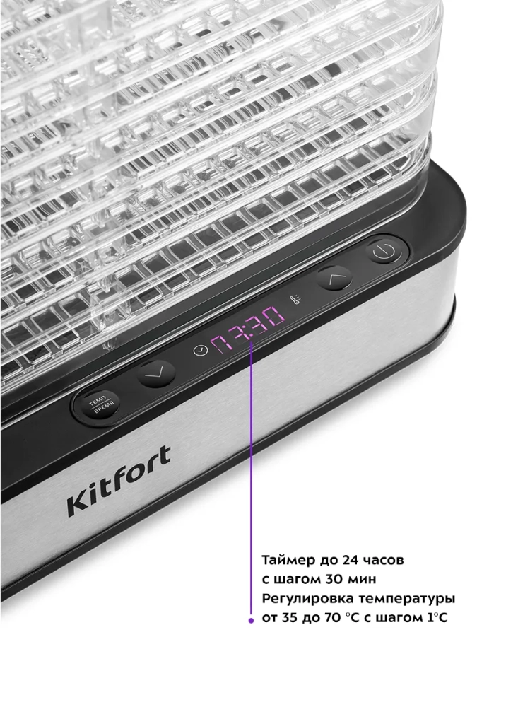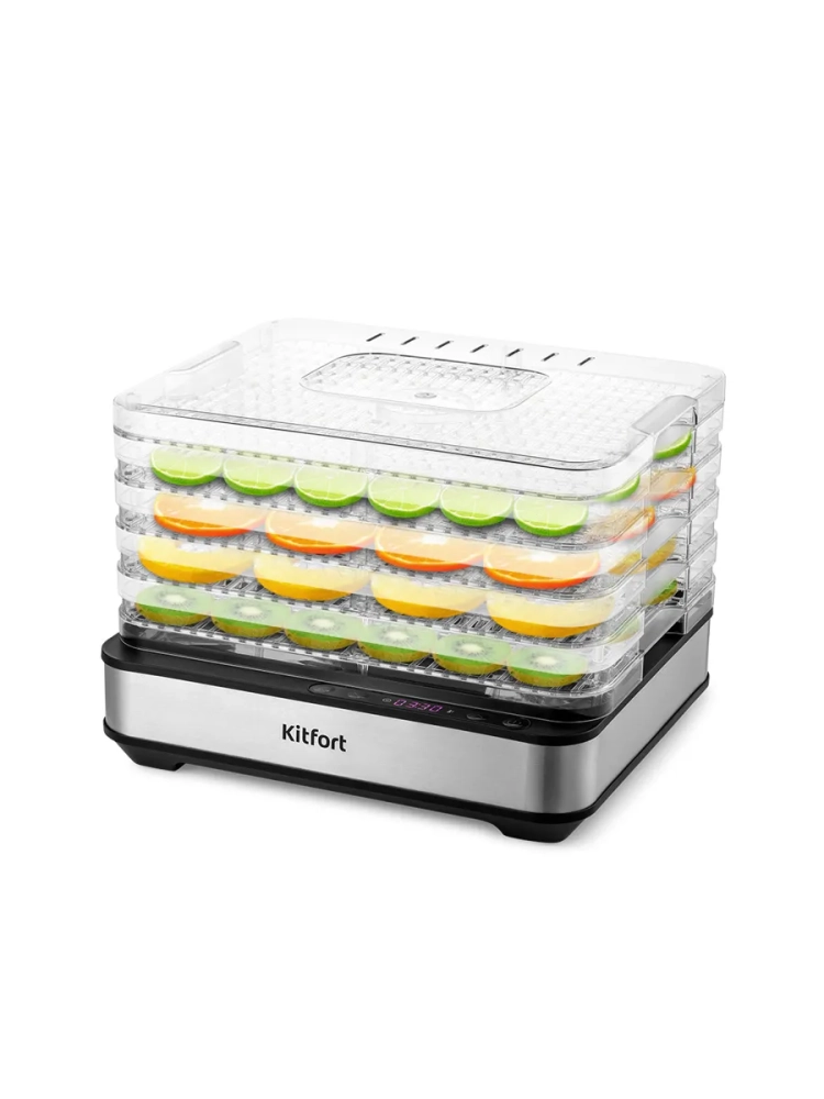 Электрическая сушилка для овощей и фруктов Kitfort КТ-1933 предназначена для сушки овощей, фруктов, ягод, грибов, корнеплодов, трав и зелени, а также хлеба. Сушилка имеет в комплекте 5 поддонов из прозрачного пластика. Благодаря прозрачным пластиковым поддонам вы легко можете наблюдать за процессом сушки. Пластик поддонов — BPA-free, он не содержит Бисфенол А, тем самым данный вид пластика безопасен для здоровья. В сушилке установлен мощный нагревательный элемент и вентилятор, обеспечивающий равномерное распределение нагретого воздуха по всему объему камеры. При помощи кнопок на панели управления вы можете установить температуру в диапазоне 35-70 *С с шагом 1 градус и время в диапазоне от 30 минут до 24 часов с шагом 30 минут.