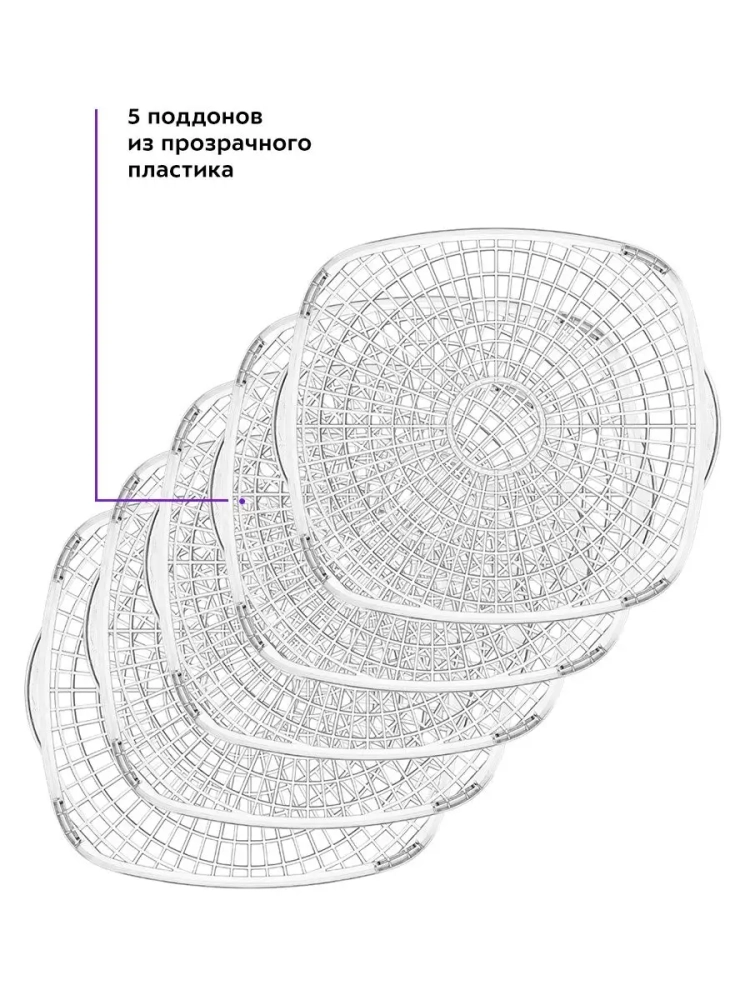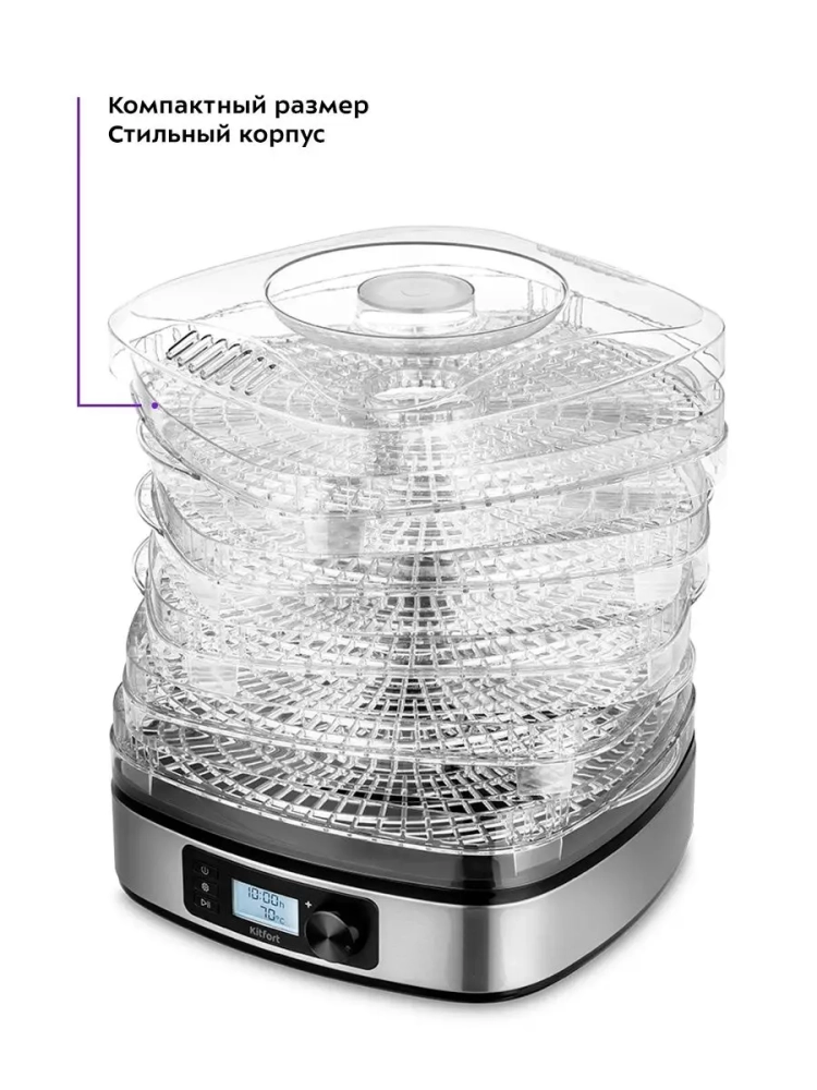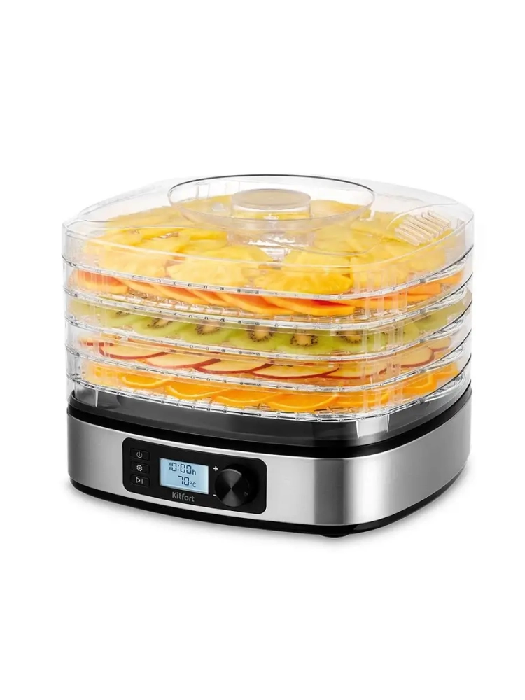 Электрическая сушилка для овощей и фруктов Kitfort КТ-1943 предназначена для сушки овощей, фруктов, ягод, грибов, корнеплодов, трав и зелени, а также хлеба. Сушилка имеет в комплекте 5 поддонов из прозрачного пластика, поэтому вы легко можете наблюдать за процессом сушки. Поддоны можно установить в двух положениях по высоте: компактно и с удвоенной высотой. В сушилке установлен мощный нагревательный элемент и вентилятор, обеспечивающий равномерное распределение нагретого воздуха по всему объему камеры. На передней панели есть регулятор, с помощью которого вы можете установить температуру в диапазоне 35–75 *С с шагом 5 градусов и время в диапазоне от 30 мин до 36 часов работы с шагом 30 минут.
