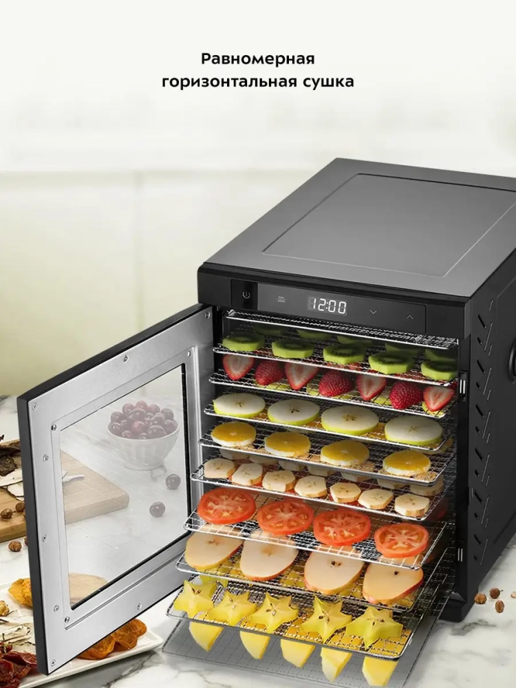 На сушилке можно установить температуру сушки в диапазоне 35–75 *С с шагом 5 градусов. Сушилка оснащена таймером до 24 часов работы с шагом 30 минут.