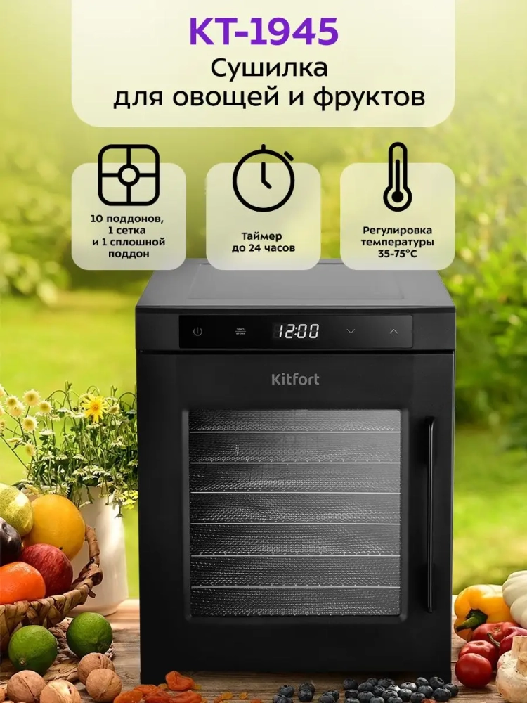 Электрическая сушилка Kitfort КТ-1945 предназначена для сушки овощей, фруктов, ягод, грибов, корнеплодов, трав и зелени, а также мяса и рыбы, хлеба. С помощью специального сплошного поддона можно готовить пастилу.