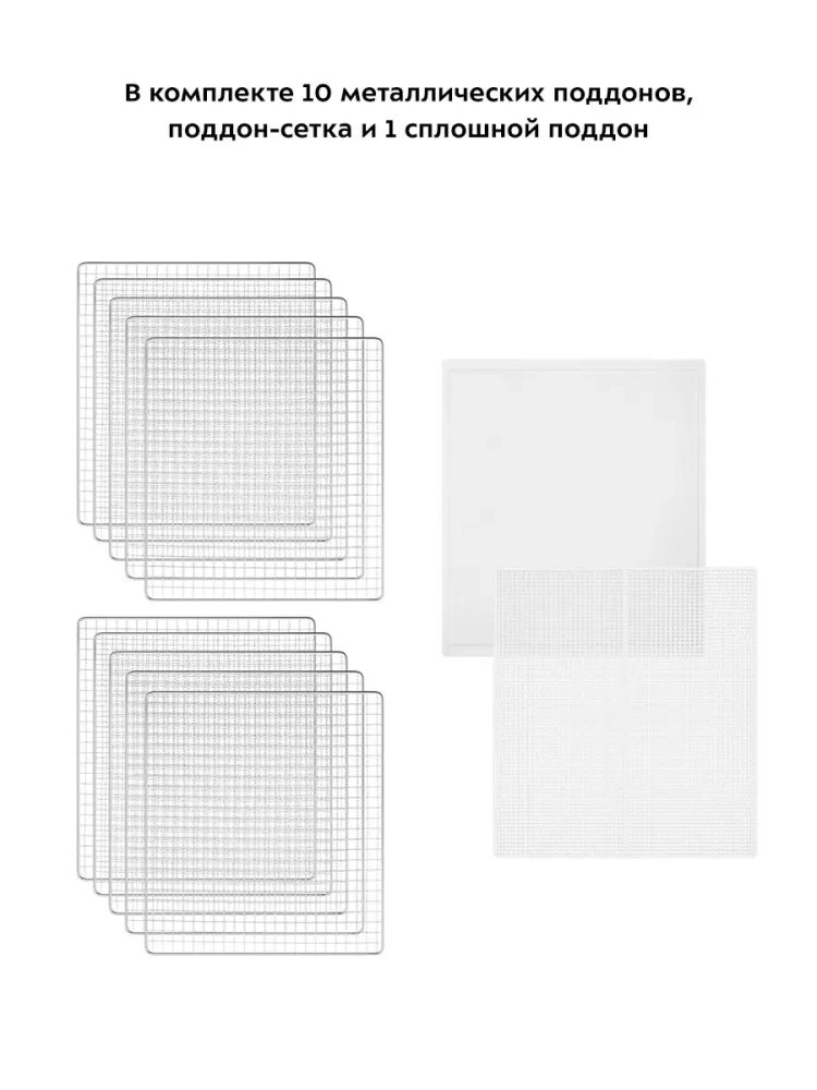 В комплекте к сушилке идут 10 металлических поддонов, 1 сетка для мелких продуктов и 1 сплошной пластиковый поддон.
