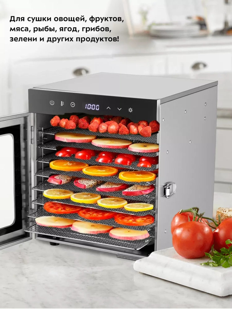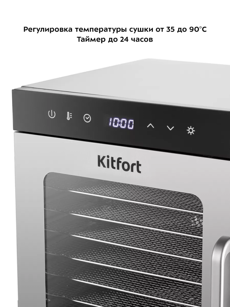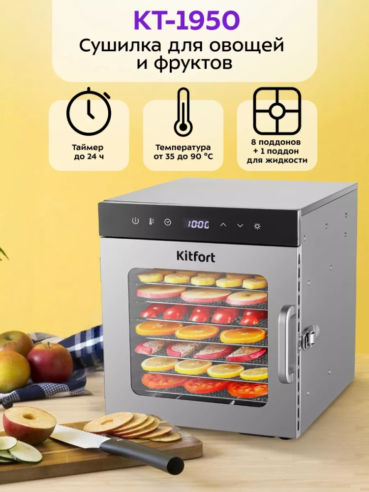 Электрическая сушилка Kitfort КТ-1950 предназначена для сушки овощей, фруктов, ягод, грибов, корнеплодов, трав и зелени, а также мяса и рыбы, хлеба.